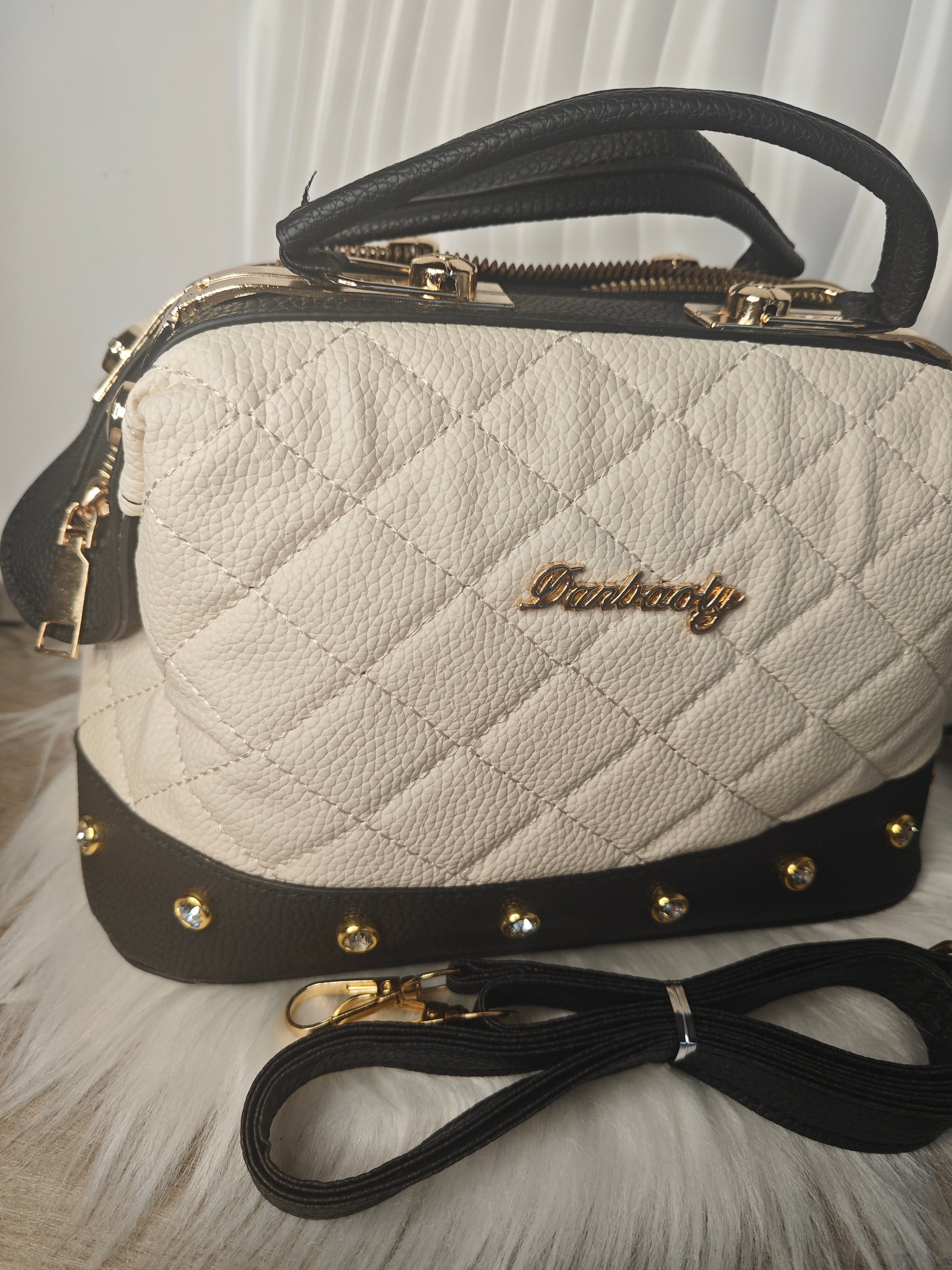 Das zarte Steppmuster in edlem Creme trifft auf tiefschwarze Kontraste und luxuriöse Golddetails – eine Kombination, die zeitlos, stilvoll und selbstbewusst wirkt.